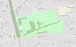 In the late 1860s, the merchant Samuel Sugden (c.1800-1896) purchased a farm and farmhouse in the area,[2] probably the one marked on an 1822 Ordnance Survey map as Oak Farm.[3] He rebuilt the house into a much more substantial residence known as Oak Lodge with a walled garden, orchard, ice well, and a collection of outbuildings.[2] The Lodge and outbuildings were demolished just after the end of the First World War[2] and in 1927 Southgate Urban District Council purchased 50 acres from Sugden's estate[4] which it combined with 8.5 acres it purchased from the Vicar of Enfield to form Oakwood Park.[2] The park opened in 1929 and after further adjustments caused by the construction of the Piccadilly Line northern extension (1932) now comprises 64 acres of land.[2] The ice well still exists[5] as do some of the original field boundaries dating from Sugden's time.[6]