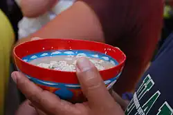 Though most chocolate is consumed as a hot drink, it is also an important ingredient in a cold beverage called tejate. The preparation is made with fermented corn, cacao, and the seed of the mamey fruit. It is traditionally served in dried and painted gourds.[12] Tejate is usually found in the towns just outside the city of Oaxaca. It is similar to the pozol of Chiapas. The drink was previously considered a complete meal.[9] However, tejate is becoming less common and harder to find.[13]