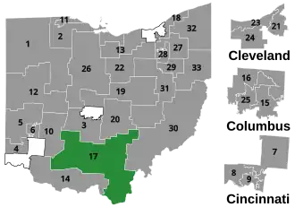 Ohio's 17th senatorial district has long been located in southeastern Ohio and currently consists of the counties of Ross, Fayette, Clinton, Highland, Pike, Jackson and Gallia as well as portions of the counties of Lawrence, Vinton and Pickaway. It encompasses Ohio House districts 91, 92 and 93. It has a Cook PVI of R+25. Its current Ohio Senator is Republican Shane Wilkin. He resides in Hillsboro, a city located in Highland County.
