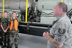 Air Force Reserve Technical Sgt. Mike Lamantia explains the C-130 Modular Aerial Spray System (MASS) to a group of Ohio Civil Air Patrol cadets.