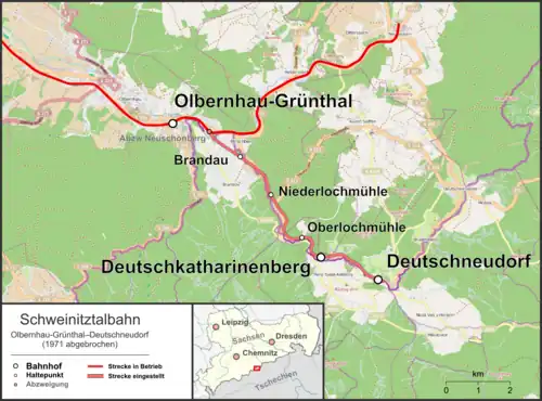 - ^ a b c d "Olbernhau-Grünthal - Deutschneudorf. Schweinitztalbahn". Sachsenschiene. 28 February 2016.