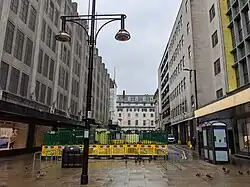 In the 1870s it included two public houses, the Red Lion at No. 5 (rebuilt 1879), on the east side, and the Crown at No. 12A (rebuilt 1885–6) and was a throughway to Oxford Street but it has since been pedestrianised at the southern end. The cul-de-sac Red Lion Yard, later known as Cavendish Buildings, ran from the eastern side before the construction of the House of Fraser (previously D.H. Evans)[2] store in Oxford Street. Today, the street is entirely taken up by the House of Fraser department store on its western side and the John Lewis store on the east, both of which front Oxford Street.