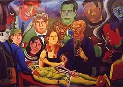 The fame of "The New Stupid" gave the artist more prominence in the art community. Through "the New Stupid" Khvostov got acquainted with fine art experts Gleb Ershov and Andrei Klyukanov who at that moment worked in Navicula Artis gallery. In 1999 they organized his first solo exhibition "Self-portraits — 200+1", which consisted of only a part of the artist's series. In 2000 Khvostov shifted to the large format and started to use emulsion paint and paper. The New Stupid society leader, Vadim Flyagin, became his first model. Then there was a comic series "Curators’ portraits" representing notable art critics of Saint Petersburg and galleries’ staff. These works led to Khvorostov getting an order to paint a multi-figured portrait for the anniversary of the "Leningrad Art Critics Club", founded by Ivan Chechot. For this portrait the artist took as a basis the renowned painting The Anatomy Lesson of Dr. Nicolaes Tulp by Rembrandt. He illustrated a figurative dead body as a "body of art" prosected by Chechot and his students.[7]