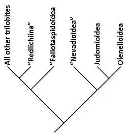 The suborder contains four superfamilies: Olenelloidea (with 3 families and 5 stemgroup genera), Judomioidea (with 1 family and 3 stemgroup genera), Nevadioidea, and Fallotaspidoidea (with 3 families and 3 stemgroup genera). Lieberman, 2002, considered that the Fallotaspidoidea are a paraphyletic group because it gave rise to the Redlichiina; he did not propose to restrict the Olenellina to the Olenelloidea, Judomioidea and Nevadioidea. Neither did he propose to assign this group of superfamilies to a newly formed order Olenellida, and consequently expand the Redlichiina to include the Fallotaspidoidea. This would imply that the Redlichiina would include taxa with and without dorsal sutures.[3]