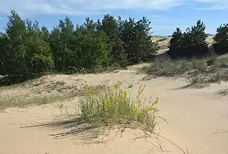 The landscape is quite varied, with sandy-steppe, semi-arid steppe, meadows, reed beds, and forest stands. The dunes of the Radensk sector are interspersed with patches of shrubs, lakes and birch groves (12% of the area).[1]