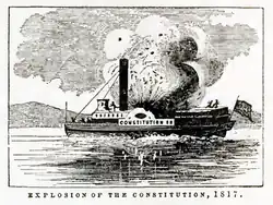 Notable examples of river steamboats that were constructed by the Pittsburgh and Mars Works include the Franklin, the Aetna and the Pennsylvania. Another, christened the Oliver Evans but renamed the Constitution by its eventual owners, was lost along with the eleven crew members when its boiler exploded near Point Coupee, Louisiana.[100] Evans was deeply distressed by the news, although he defended the safety of high-pressure engines and cited any explosions as an extremely rare occurrences.[101]