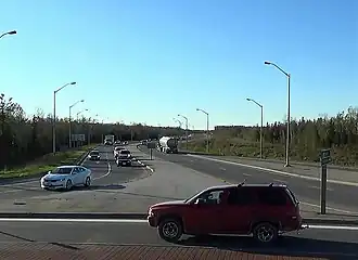 Since then, the route has remained almost unchanged, except in the Collingwood and Barrie areas. Prior to the completion of the Pretty River Parkway in Collingwood in the mid-1970s,[18][19] Highway 26 was routed through Collingwood along Hume Street, before making a 90 degree right turn (north) at the intersection with Highway 24 (Now Simcoe Road 124, Hurontario Street) with which it was concurrent until the terminus of Highway 24 at First Street, where Highway 26 makes a 90 degree left turn (west) onto First Street, continuing on the present route.[20] The Pretty River Parkway was a bypass of this highly congested downtown route, branching off to the north from Hume Street and swinging gradually westward along the shoreline until becoming Huron Street, which is the eastward extension of First Street beyond Hurontario. In 2003, Pretty River Parkway was widened to four lanes to match the existing sections of Huron and First Streets.