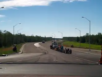 In 2001, the Georgian Triangle Area Transportation Study determined that traffic levels along Highway 26 both east and west of Collingwood were exceeding capacity. The Simcoe Area Transportation Network Needs Assessment repeated this analysis the following year.[21] Subsequently, work on a new bypass east of Collingwood began on April 11, 2003.[22] The old route was a dangerous section of road with numerous intersecting side streets and private residences with direct highway entrances, while the bypass is a fully-controlled access four-lane divided highway without any at-grade crossings. The new alignment has the highway veer west in the west end of Wasaga Beach, and from a roundabout with Mosley Street it runs parallel to and south of the old route to a roundabout at Poplar Sideroad, near the eastern town limits of Collingwood. The bypass opened on November 14, 2012.[23] The former route is now known as Beachwood Road from Collingwood to Mosley Street in Wasaga Beach. The remaining section of the former alignment south of Mosley Street has been renamed Lyons Court.[24]