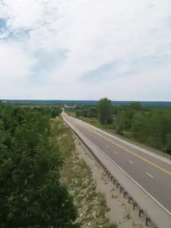 Highway 26 between Owen Sound and Meaford in the west is not as highly travelled as the tourist areas to the east.[1] From Meaford eastwards, the highway runs along the Georgian Bay shoreline, and in The Blue Mountains, extending from Thornbury eastwards through to the west limits of Collingwood. It passes through a nearly continuous corridor of low-density resort-style residential developments, mostly concentrated in the Blue Mountain Resort area. Between Collingwood and Wasaga Beach, the highway is a four-lane divided roadway with roundabouts transitioning to the undivided sections at both ends: one at Mosely Street in Wasaga Beach, and the other at Poplar Sideroad in Collingwood.[4]