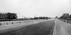 Planning for the route that would become Highway 402 began following the completion of the Blue Water Bridge in 1938. A divided highway was constructed through Sarnia following World War II; it was completed and designated in 1953.[20] The Department of Highways announced its intent to extend the route to Highway 401 in 1957.[21] However, while some preliminary work began in the early 1960s, it would take until 1968 for a preferred route to be announced,[22] and until 1972 for construction to begin.[23] Work was carried out through the remainder of the 1970s, and the freeway was completed and ceremonially opened in late 1982.[24] Since completion as a four-lane route, expansion work has been concentrated on the portion of the freeway in Sarnia approaching the border crossing.[25]