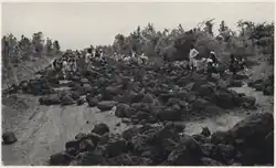 Some 1,000 ox carts, 15,000 wheelbarrows and 1,500 trucks were used to carry building materials. There were no bulldozers, power shovels or graders. The topsoil and some of the subsoil was removed with hoes and was carried away in wicker baskets on shoulder poles by men and boys. The subsoil was rolled flat using huge concrete rollers hauled by up to 300 workers. A layer of pebbles taken from nearby streams was laid down using wheelbarrows.[53][55] Over 300,000 cubic meters (390,000 cu yd) were used for the runways and taxiways.[54] Workers collected them from the banks of the Min River. When this source became depleted, they waded into the freezing rapids and shoals to collect them from the riverbed.[56] Rocks had to be used to supplement the pebbles. Men, women and children shaped them with hammers and chisels so they would not shift about. A slurry of topsoil and subsoil was laid atop the rocks as a binder, which was then rolled flat. Successive layers of rock and slurry were laid down.[53][57] Saunders landed the first B-29 at Guanghan on 24 April, where he was met by officials including Wolfe, Zhang, and Major General Claire L. Chennault, the commander of the China-based Fourteenth Air Force.[58] All four airfields were completed by 10 May 1944.[53][59]