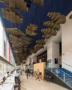 The new house was decorated by a large painting commissioned from Marc Chagall in 1959, Commedia dell’Arte.[9][10] The ceiling of the foyer which is common for play and opera is decorated with a sculpture by Zoltán Kemény, Goldwolken (golden clouds).[11][12] The house was opened in December 1963.[11]