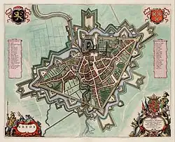 At the time the college was founded, Breda was a town of only about 4,000 inhabitants, not counting the soldiers.[5] Six months after its establishment, the college had fewer than sixty students, and its level and status were still unclear.[4] In the event, it proved to be "a general training-centre for young men of quality, many of whom were to be officers or already held that rank in the Prince's army". However, a high proportion of those taught were French Huguenots and English expatriates.[6]
