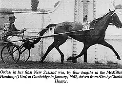 Ordeal was a New Zealand Standardbred racemare. A notable achievement was winning the Rowe Cup, the top event in New Zealand for trotting horses.[2] Ordeal was considered the top trotter in New Zealand in the 1960s, but had moderate success in the United States. She was the first ever trotter to break the 2:00 mile barrier in New Zealand.