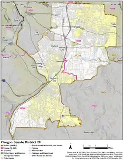 District 20 of the Oregon State Senate comprises northern Clackamas County and encompasses the communities between Oregon City and Happy Valley. It is composed of Oregon House districts 39 and 40. The district is currently represented by Democrat Mark Meek of Gladstone.