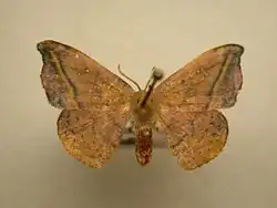 Oreta rosea, the rose hooktip moth, is a moth in the family Drepanidae. It was described by Francis Walker in 1855.[2] It is found in North America, where it has been recorded across boreal Canada to eastern North America. In the north, the range extends to northern Alberta, northern Manitoba and Newfoundland. It is also found east of the Great Plains as far south as Florida and eastern Texas. The habitat consists of moist temperate hardwood forests.[3]