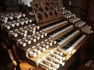 The organ console; notice the stop knobs made of ivory