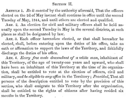 In the preamble this "temporary government" was intended to exist "until such time as the United States of America extend their jurisdiction over us."[11] The articles of the first Section were from the 14th section of the Northwest Ordinance, with minor modifications.[11][12] The first three articles were identical to the Ordinance, outside of a change related to relations with Indigenous peoples. Wars against the natives were to be commenced by "representatives of the people" instead of the Congress.[11][12] The fourth and final article was from the sixth article of the Ordinance, banning slavery outside use as a punishment. The portion of the sixth article related to restitution of runaways to slave states was not included in the Organic Laws.[11][12]