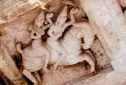 There are also theories that during their early rule, multiple Ganga branches may have operated from Talakad (Mysore district), Kaivara (Kolar district) and Paruvi (Ananthpur district).[26] The multiple branch theory has been rejected by other historians.[27] It however seems clear that from the time of Harivarman and his successor Madhavavarman II, the Gangas had established themselves firmly from Talakad, with the other two possible branches becoming indistinguishable.[28] It has been suggested that during their early rule from South Karnataka region, they were subordinates of the Pallavas of Kanchi, though contrary evidences are present in the early inscriptions of King Madhavavarman I.[29]