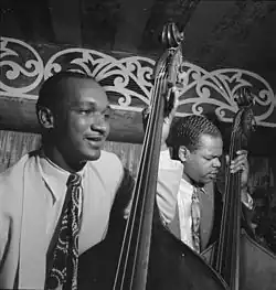 In 1942, Pettiford joined the Charlie Barnet band and in 1943 gained wider public attention after recording with Coleman Hawkins on his "The Man I Love".[1] Pettiford also recorded with Earl Hines and Ben Webster around this time.[1] After he moved to New York, he was one of the musicians (together with Dizzy Gillespie, Thelonious Monk, Kenny Clarke) who in the early 1940s jammed at Minton's Playhouse, where the music style developed that was later called bebop.[1] Pettiford and Dizzy Gillespie led a bop group in 1943.[1] In 1945, Pettiford went with Hawkins to California, where he appeared in The Crimson Canary, a mystery movie known for its jazz soundtrack, which also featured Josh White. He then worked with Duke Ellington from 1945 to 1948 and for Woody Herman in 1949, before working mainly as a leader in the 1950s.[1]