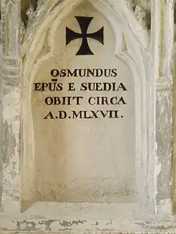 Bishop Osmund was one of seven notable individuals from the pre-Conquest era considered by the Benedictine monks of Ely to be so worthy of commemoration as benefactors that their remains, originally entombed in the abbey-church dating from 970, were carefully exhumed for preservation in the Norman-era church which was built to replace it and in 1109 became Ely Cathedral. The remains of the so-called 'Seven Confessors of' Ely have been housed, since the late 18th century, when they were last exhumed, in caskets within a monument situated in Bishop West's Chapel, at the south-east corner of the Cathedral and Osmund is commemorated simply, in Latin, as 'a bishop from out of Sweden'.[10]