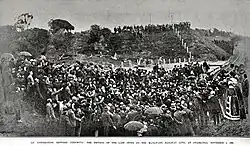 The station was opened on 2 August 1886. The two ends of the line met at Otaihanga on 27 October, and the last spike was driven at a public ceremony by Governor William Jervois on 3 November 1886 before more than a thousand people.[2] The first revenue-earning train, a stock train from Longburn to Johnsonville with 355 sheep and 60 head of cattle had run on 30 October.[3] The last spike monument is now in the carpark at Southward Car Museum.[4]