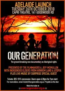 5. ^ a b c Wotzke, Anders (15 October 2010). "Aboriginal Rights Documentary 'Our Generation' Tours the Country". Moviedex. Retrieved 30 December 2014.