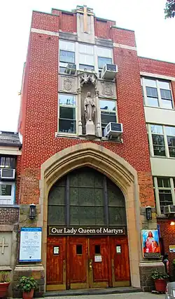 Our Lady Queen of Martyrs Church, located at 81 Arden Street at Dongan Place, between Broadway and Sherman Avenue in the Inwood neighborhood of Manhattan, New York City, is a Roman Catholic parish church in the Roman Catholic Archdiocese of New York. The parish was established in 1927 and a church was built in 1928 to designs by Gustave E. Steinback.