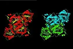 Two colorizations of the dimeric substructure of the enzyme. Left side distinguishes the enzyme's secondary structures and right side distinguishes the two monomers. Derived from 2JI6