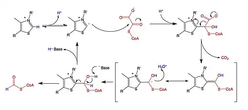 A key feature of the cofactor TPP is the relatively acidic proton bound to the carbon atom between the nitrogen and sulfur in the thiazole ring, which has a pKa near 10.[11] This carbon center ionizes to form a carbanion, which adds to the carbonyl group of oxalyl-CoA. This addition is followed by the decarboxylation of oxalyl-CoA, and then the oxidation and removal of formyl-CoA to regenerate the carbanion form of TPP. While the reaction mechanism is shared with other TPP-dependent enzymes, the residues found in the active site of OXC are unique, which has raised questions about whether TDP must be deprotonated by a basic amino acid at a second site away from the carbanion-forming site to activate the cofactor.[12]