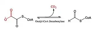 OXC belongs to the family of lyases, specifically the carboxy-lyases (decarboxylases), which cleave carbon-carbon bonds. The systematic name of this enzyme class is oxalyl-CoA carboxy-lyase (formyl-CoA-forming). Other names in common use include oxalyl coenzyme A decarboxylase, and oxalyl-CoA carboxy-lyase. This enzyme participates in glyoxylate and dicarboxylate metabolism. It employs one cofactor, thiamin diphosphate (TPP), and plays a key role in catabolism of oxalate, a highly toxic compound that is a product of the oxidation of carbohydrates in many bacteria and plants.[1] Oxalyl-CoA decarboxylase is extremely important for the elimination of ingested oxalates found in human foodstuffs like coffee, tea, and chocolate,[2] and the ingestion of such foods in the absence of Oxalobacter formigenes in the gut can result in kidney disease or even death as a result of oxalate poisoning.[3]