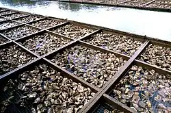 A similar method was to use terracotta, slate, or fibro-cement roofing tiles instead of stone slabs.[68][69][70] In the inter-tidal zone, the tiles were sometimes placed in an inverted 'V' and sometimes laid against wooden supports.[70][69][71] Tiles usually had a larger surface area for their weight, and were easier to relocate than stone slabs. As a variant of the method using tiles, as late as 1908, divers were still being used to place the oyster-covered roof tiles on the bottom in deeper water, to allow the oysters to mature.[63] Disadvantages of the methods using stone and tiles were that these were labour-intensive—harvesting involved knocking off each oyster with a hammer or other tool—[35] it was relatively difficult to relocate the oysters elsewhere in the estuary, and that, at least without using divers, the method could only be used where the bottom was exposed at low tide.