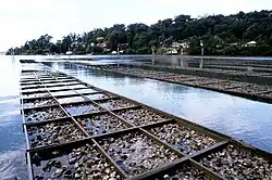 By the early 1920s, some oyster farmers were fattening mature oysters by placing the oysters on wire netting trays, which were in turn placed on timber frames, or 'rails', which kept the trays within the inter-tidal zone and were embedded in the bottom.[10] This method became known as 'tray and rail'. It had the advantage that the level of the oysters was not dictated by the level of the bottom, allowing inter-tidal oyster leases to be extended into deeper water. It also kept the oysters well above the muddy bottom, reducing the risk of mudworm attack.