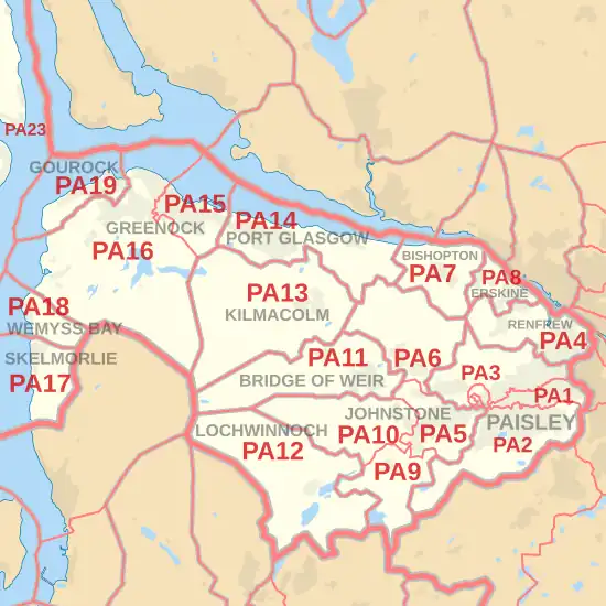 The PA postcode area, also known as the Paisley postcode area,[2] is a group of 67 postcode districts in western Scotland, within 35 post towns. These cover Renfrewshire (including Paisley, Renfrew, Johnstone, Bishopton, Erskine, Bridge of Weir and Lochwinnoch), Inverclyde (including Greenock, Port Glasgow, Gourock, Kilmacolm and Wemyss Bay) and most of Argyll and Bute (including Oban, Lochgilphead, Tarbert, Campbeltown, Appin, Taynuilt, Bridge of Orchy, Dalmally, Inveraray, Cairndow, Colintraive, Dunoon, Tighnabruaich, and the Isles of Mull, Iona, Coll, Tiree, Jura, Colonsay, Islay, Gigha and Bute), plus small parts of North Ayrshire (including Skelmorlie) and Highland.