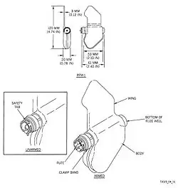 The mine consists of a polyethylene plastic container containing 37 g (1.3 oz) of VS-6D or VS-60D liquid explosive.[1][4] The two wings of the PFM-1 allow it to glide after being released in the air, then spin, stabilizing it and slowing its descent, similar to maple seeds.[5][1] The thick wing contains the liquid explosive.[5] The two wings together are 120 mm (4.7 in) long.[6] The plastic body can be produced in a variety of colours for best camouflage. As existing stocks were in European green rather than sand coloured, the first examples used in 1980s Afghanistan were green and easily visible. This led to their name 'green parrots'.[5]