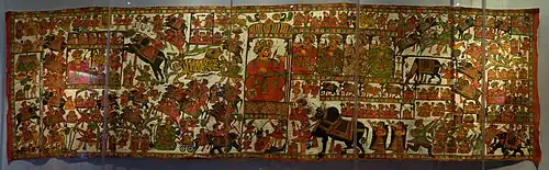 Pabuji Ki Phad is a religious scroll painting of folk deities, which is used for a musical rendition of the only surviving ancient traditional folk art form, Phad painting in the world of the epic of Pabuji, the Rathore Rajput chief.[1][2][3][4][5] Bhopas of Pabusar are the bards and also priests who are the traditional narrators of this art form. The Phad is also spelt as "Par". This art form is popular in the Indian state of Rajasthan. Literally, 'Pabuji Ki Phad' translates into two versions namely, "The Screen of Pabuji or O, Read of Pabuji!. Pabuji is also known as "the Ascetic Deity of Sand Desert".[1][2][3][4][5]