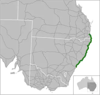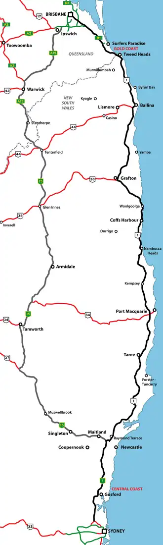 Pacific Highway is a national highway and major transport route of 790 kilometres (490 mi)[1] along the east coast of Australia from Sydney to Brisbane.[1] It is an integral part of Highway 1 which circumnavigates the Australian continent. At its inception, the highway was a single carriageway between Sydney and Brisbane. In Australian culture and as a tourist drive, it remains so.[4] Over time, segments of the highway have been relegated from the route and, or, renamed and between 1996 and 2020, the highway was upgraded to the standards of a controlled-access highway (motorway).[5]