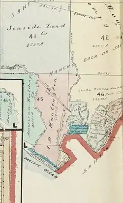 During the period of Mexican rule of California, the land that became Pacific Palisades belonged to Rancho Boca de Santa Monica, granted by the governor of California to Francisco Marquez and Ysidro Reyes in 1839.[13] The Ysidro Reyes Adobe was the first adobe home ever built in Santa Monica Canyon, erected in the year 1838 on land now known as Pampas Ricas Blvd in Pacific Palisades.[14] Sketches of adobe dwelling exist in the collection of the UCLA Library.[15][16] A memorial plaque sits in a boulder on Pampas Ricas Blvd commemorating the adobe house, dedicated in the 1950s.[17] Ysidro Reyes died in 1863. Reyes left his portion of Rancho Boca de Santa Monica to his widow, Maria Antonia Villa, who sold it to developer and railroad magnate Robert Symington Baker in 1875.[18]
