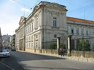 Originally a Dominican friary and house of formation affiliated with the University of Coimbra, the College of St. Thomas was established in 1538. Its name referred to Dominican saint and Doctor of the Church Thomas Aquinas. Construction began in the 1540s under the rector Fr. Martinho de Ledesma, with plans by Asturian architect Diogo de Castilho. The educational and residential areas of the college were arranged around a central cloister. In the 18th century, the upper floor on the east side was expanded and renovated according to contemporary taste, including the addition of new windows and a balcony to the facade.[1]