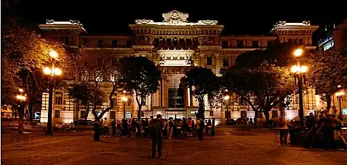During the construction works, Ramos had the support of Domiziano Rossi, who designed the Palace based on the Palazzo di Giustizia, located in the city of Rome, Italy.[4][2] Due to the delay in concluding the project, the population became skeptical and pessimistic about the completion of the building, so much so that the construction ended up being nicknamed "unfinished symphony". The delay in construction was justified by the scarce funds that were granted annually by the government. The building was completed in 1933, after receiving more funds.[4]