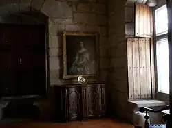 The plan developed around a rectangular building with four rectangular towers, around an interior courtyard dominated by the chapel on the southeast wing. The spaces are articulated and staggered horizontal floors, covered with different roof tiles, in addition to with six tall chimneys.[1] Each façades is made of granite, masonry block and interspersed by rectangular windows of varying styles: cruciform, stained-glass, standard and oblique. A few of the first floor windows are covered in metal grating. The northwest façade has an arch doorway surmounted by corbels and is recessed from the two towers. The superior floor is a balcony that runs the length of the interior courtyard, supported by corbels, which unite the guard towers. The lateral (northeast and southwest) façades are of a lower height and covered by trim and corbels, that supports the covered balcony, interspersed by openings at floor level. The southwest wing is broken by the body of the chapel, which extends away from the façade (identifiable by two large Flemish stained-glass windows), and is highlighted by a cantilever roof within the courtyard.[1]