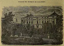 The building dates from early 19th century.[2] It was built as a dowry for the Duchess of Abrantes, for which circumstance was designated with the name of "la casa de los alfileres" (the house of the pins).[2] [2][a] In the new building lived the Marquis of Ariza, the Russian ambassador, Prince Tatischef, and the famous provisionist of the French army and great financial Gabriel-Julien Ouvrard, in 1823 and 1824, at which time were held on its halls magnificent soirees and banquets, until it acquired the Catalan Marquis of Riera, who invested large sums in the decoration.[2] The extension of the house and gardens was considerable, besides providing in front, on calle del Turco,[b] other big housing for garages and offices, with which had connexion through a tunnel.[2]
