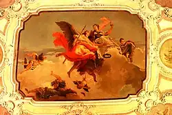 The central oil on canvas was painted by Tiepolo in 1744-1745. Next to the two female figures representing Virtue and Nobility there is a young page holding a drape of their vest: it is probably a portrait of the painter's son, Giuseppe Maria. Behind him we notice another figure, supposedly a self-portrait of the artist himself. Ignorance, defeated, falls down dragging with her a winged genie who is holding a bat, allegory of Vice. This celebrative representation, dear to the masters of the house, is also an example of Tiepolo's artistic maturity, highly influenced by Veronese models.