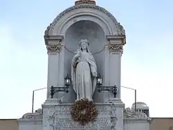 The main facade presents three orders of eight windows and a single sequence of nine balconies in the main floor (the "piano nobile"). Under the central balcony there is a high relief depicting an imposing marble eagle, work of Salvatore Valenti. Over the main facade's cornice, in central position, there is the statue of Saint Rosalia, work of Carlo D'Aprile (1661).[2] Under the statue, it is located a big clock arrived from Paris in 1864. At the top of the building, the four angles are decorated with four eagles, work of Domenico Costantino.[2]