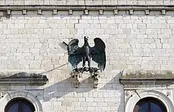 On the third floor is a bronze eagle sculpture, l'Aquila di Todi (1339) or Tuderta, by Giovanni di Gigliaccio. Among the legends justifying the use of this symbol in Todi, one holds that the early pre-Roman inhabitants had planned to site the town in the valley next to the River Tiber, but a sheet used to map out the locale was snatched by an eagle and deposited on the hilltop. The inhabitants took this augur as a sign to relocate.[1]