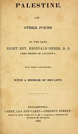 Montefiore, writing in 1902, described the poem as "the most successful and popular piece of religious verse of the first half of the [19th] century".[3] A later biographer, Derrick Hughes, finds its contemporary acclaim puzzling: "It is not a good, not even a mediocre poem; it is leaden".[4] In the United States it was published as Palestine and other poems, and also included memoirs of Heber's life.