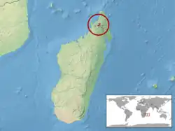 Palleon lolontany is endemic to Mount Tsaratanana (Maromokotro), Madagascar's highest mountain, on the Tsaratanana Massif. Its type locality is Matsabory Lake and Mount Tsaratanana at 2,050 m (6,730 ft) above mean sea level.[3] Currently, P. lolontany specimens can be found between 1,600 and 2,100 m (5,200 and 6,900 ft) in one humid Tsaratanana forest, over an area of 300 km2 (120 sq mi), the estimated size of suitable habitat in Tsaratanana for the species.[4] At the most, the species can be found over an area of 468 km2 (181 sq mi).[1] It is listed as Near Threatened because it is only found at most in 468 square km, and if the slash-and-burn method of agriculture were used, the species would continue to decline in number, making the list of an endangered species. The species is also at risk from logging, although it is up to 2100 m above sea level. Currently, the population is stable.[1]