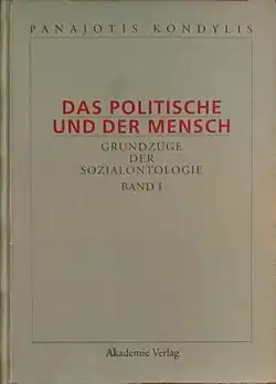 His final major work Das Politische und der Mensch (The Political and Man) remained unfinished at the time of his death, but nevertheless managed to present a unified social-scientific theory or "value-free" description of social phenomena, encompassing socio-ontological, sociological and historical aspects of the study of human affairs. Kondylis's conception of social ontology does not offer any fixed causalities or laws nor does it say what people ought to do or not do in any given situation or how their social action should unfold. The task of social ontology is accordingly not to reduce fluid and varied phenomena to basic samples and basic genetic factors; what is sought is to show the spectrum of the forces and factors, which can be constituted and become discernible only from the – irreducible and inexhaustible – diversity of form. Such forces and factors, of course, include certain constants such as striving for self-preservation through the expanding of one's own power, and the friend–foe relation, which exist in all societies and are actualised in concrete historical situations and therefore have concrete dimension and content e.g. when the dominant paradigm might be theocentrism or anthropocentrism or mass democratic post-Modernity. Much of the nearly completed first volume (three volumes had been planned by Kondylis) is an analysis of mass-democratic ideology in the social sciences while also dealing with methodological and theoretical questions such as the distinction between "socio-ontic observation" and "socio-historical observation" and the three key aspects of the social: the social relation, the political and man. Moreover, Kondylis examines the social relation as regards its "internal" mechanism of subjectivity and "external" mechanism of action, the friend–foe polarity and the social relation's continuity, in addition to exploring the concepts of understanding and rationality by way of an extensive examination and/or critique of numerous renowned authors such as Martin Buber, Émile Durkheim, Wilhelm Dilthey, Jürgen Habermas, Martin Heidegger, Edmund Husserl, Niklas Luhmann, George Herbert Mead, Alfred Schütz, Talcott Parsons, Karl Popper, Georg Simmel, Ferdinand Tönnies, Max Weber and Leopold von Wiese.