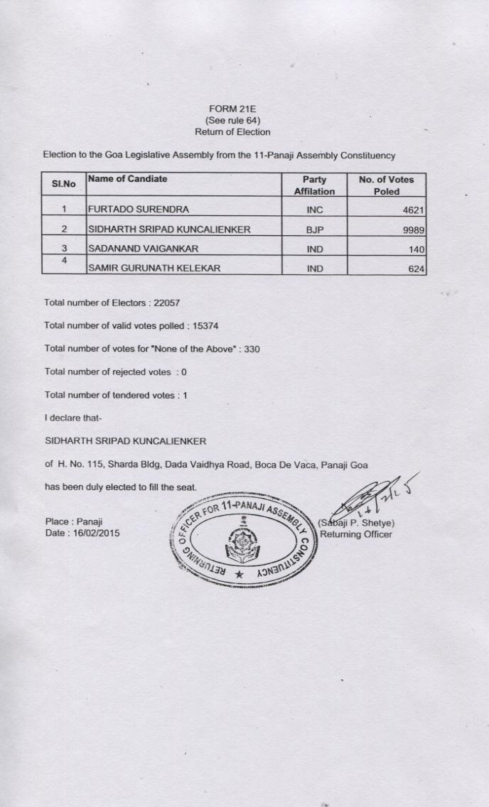 | BJP | Sidharth Kuncalienker | 7,924 | 45.70% | ||