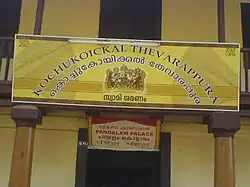 (Malayalam: പന്തളം കൊട്ടാരം) is a royal palace of Pandalam located on the banks of Achankovil river was the residence of royal family members.[10] The architectural mixtures of both Pandyas and Keralites can be witnessed in any corner of the palace. Mud, bamboo, stone and wood are the mostly used construction components in the old structures. It was in this palace that lord Ayyappa spent his childhood. In course of time, many parts of the palace were taken away by minor conflagrations and floods. But quite a few structures like Valiyakoikkal temple, Kaipuzha temple and Thevarappura remains still which depicts the ancient history and archaeological importance.[11]